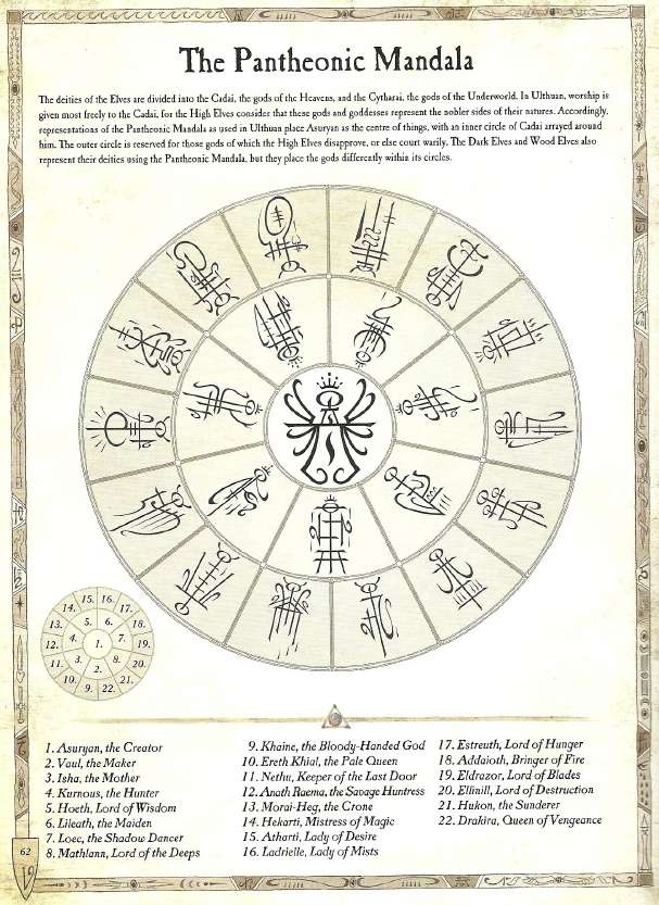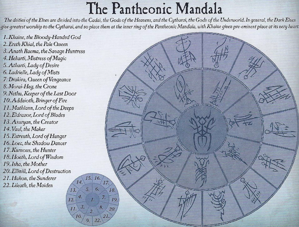 I rzeczywiście, jeśli spojrzymy na mandalę Asrai różni się ona znacznie od tych, z jakich korzystają zarówno Asurowie, jak i Druchii. U Leśnych Elfów w takim samym układzie dwudziestu dwóch pól znajdujemy występujących obok siebie zarówno „jasnych” bogów Cadai jak i „mrocznych” bogów Cytharai. A w jej centralnym punkcie znajdują się Kurnous i Isha.